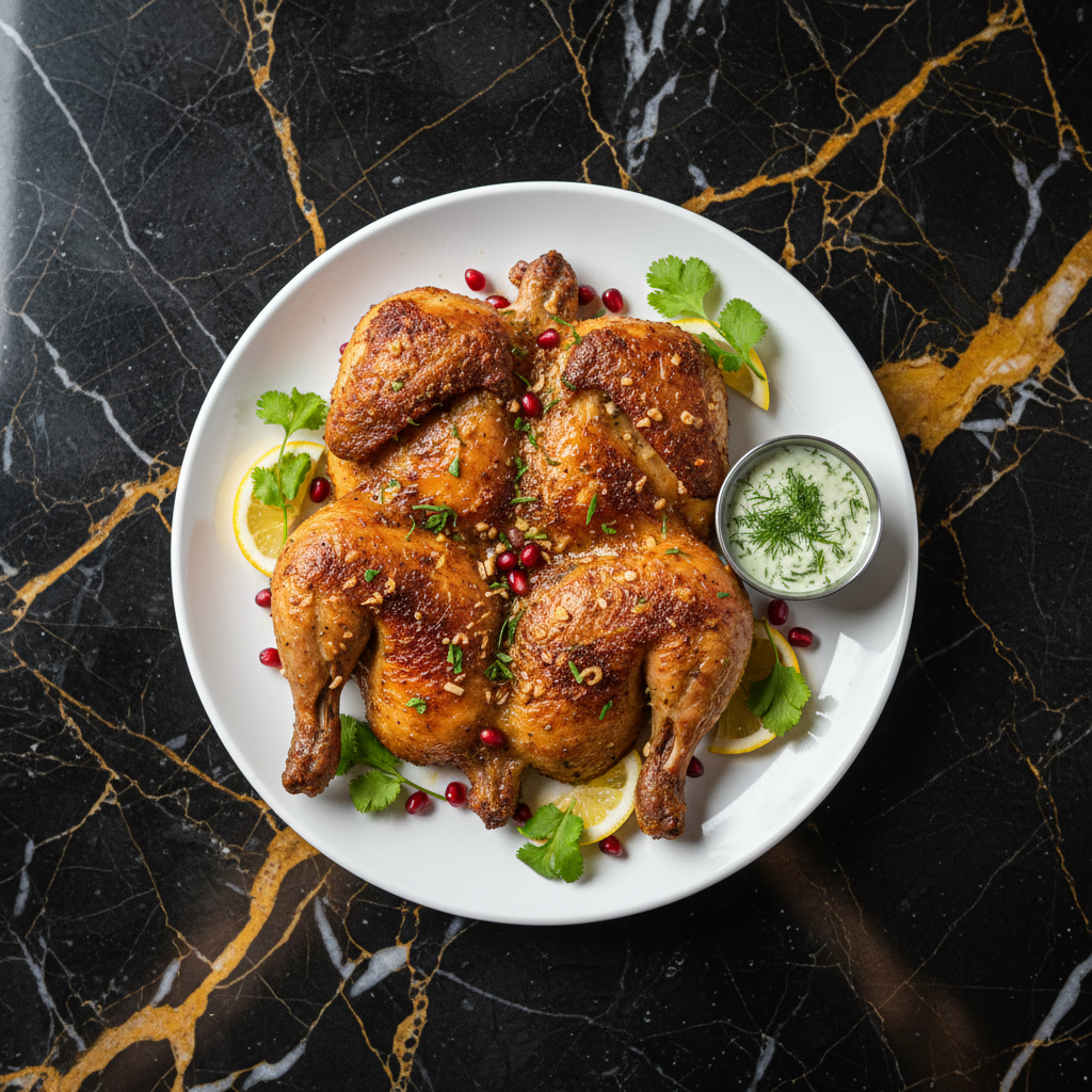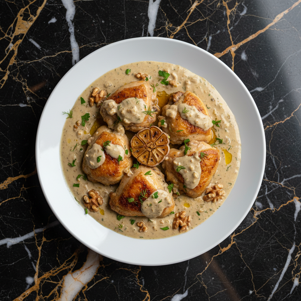A succulent roasted chicken bathed in a rich, creamy garlic and walnut sauce, inspired by the classic Shkmeruli but with a focus on the sauce's texture and depth.