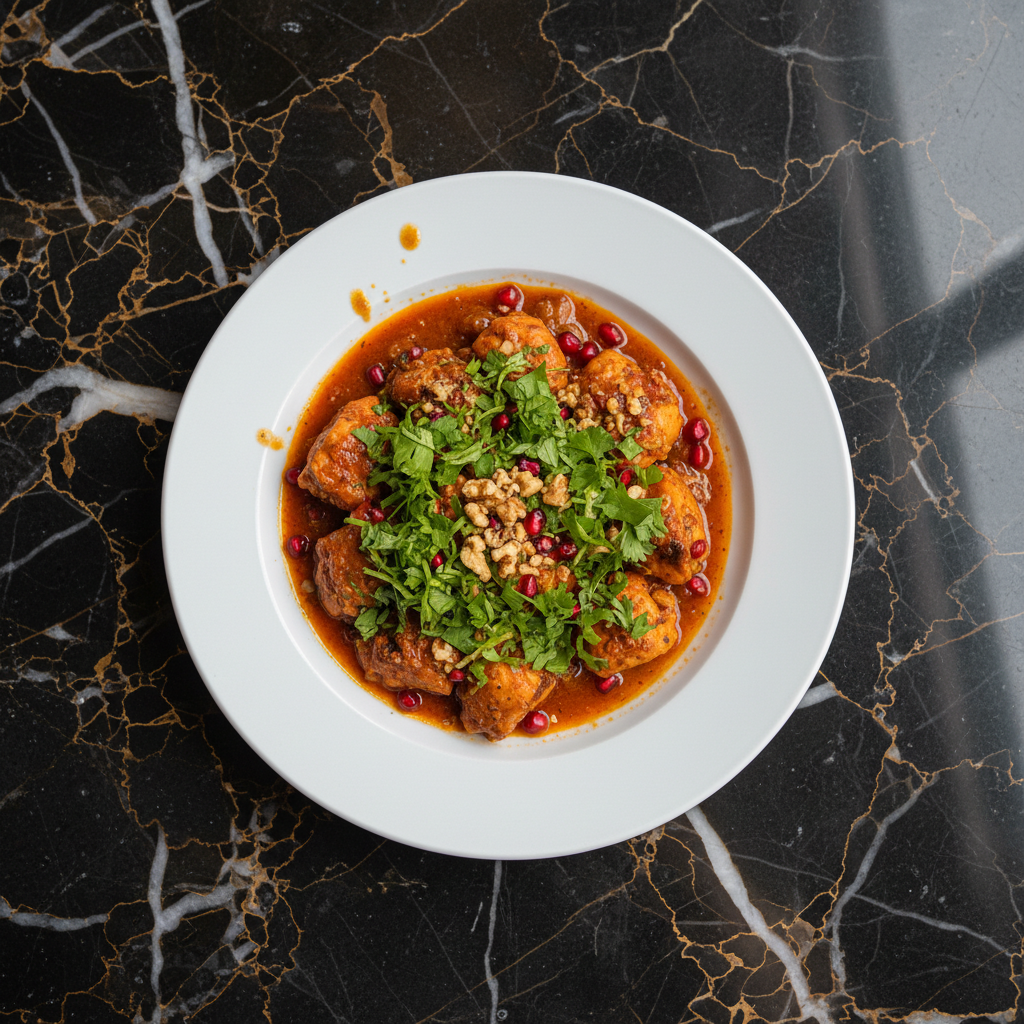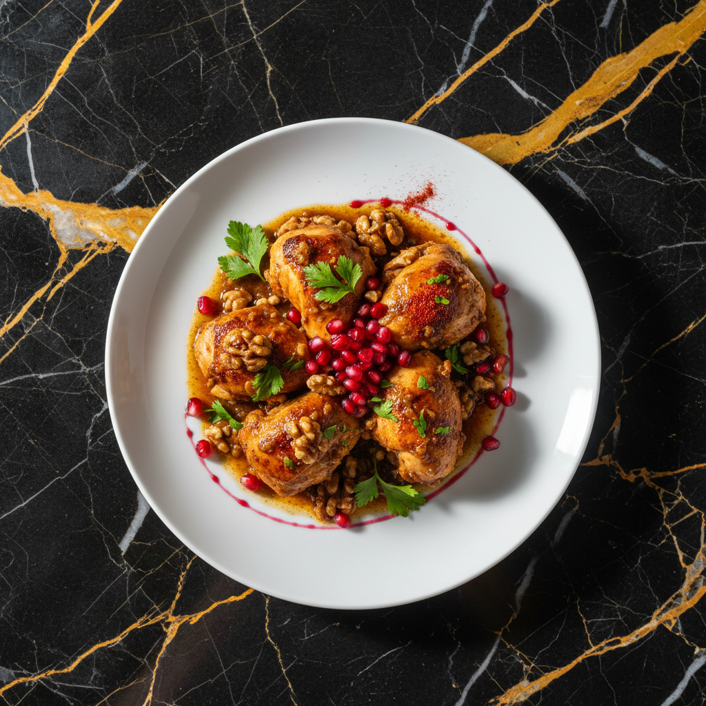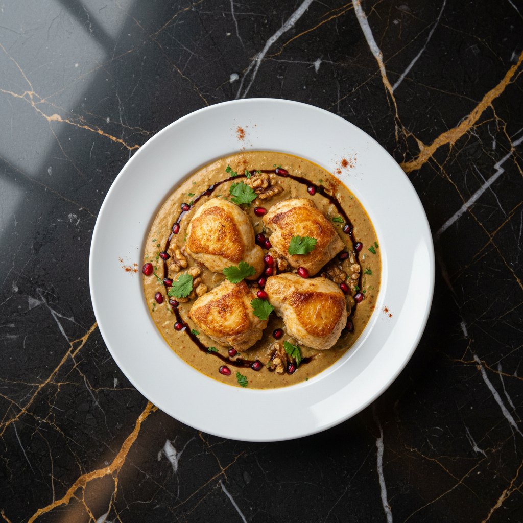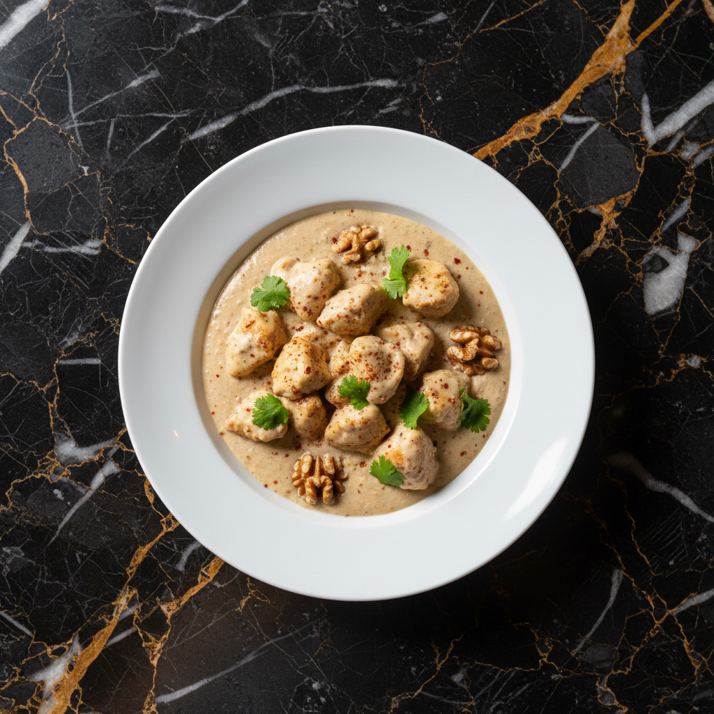 A flavorful and aromatic Georgian dish featuring tender chicken pieces simmered in a rich sauce of ground walnuts, pomegranate molasses, and fragrant spices. This dish is often served during celebrations and special occasions.