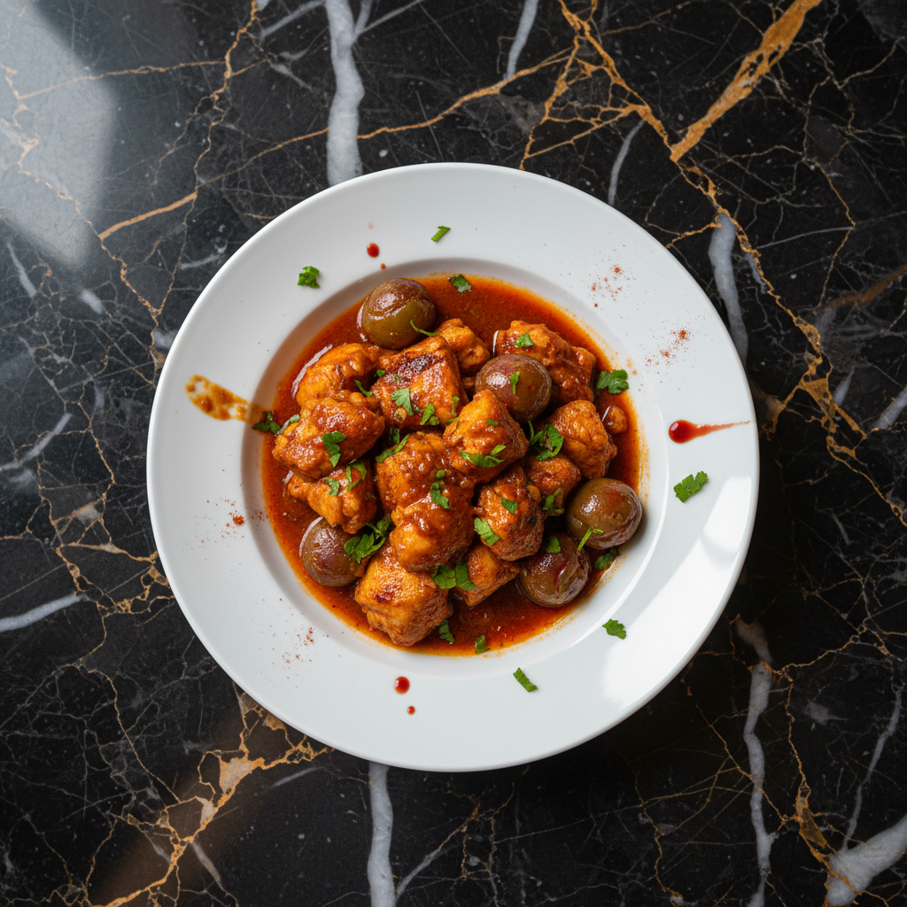 Tender chicken pieces simmered in a flavorful sauce made with sour plum (tkemali), onions, garlic, and a blend of Georgian spices. This dish offers a unique sweet and tart profile, characteristic of Georgian cuisine.