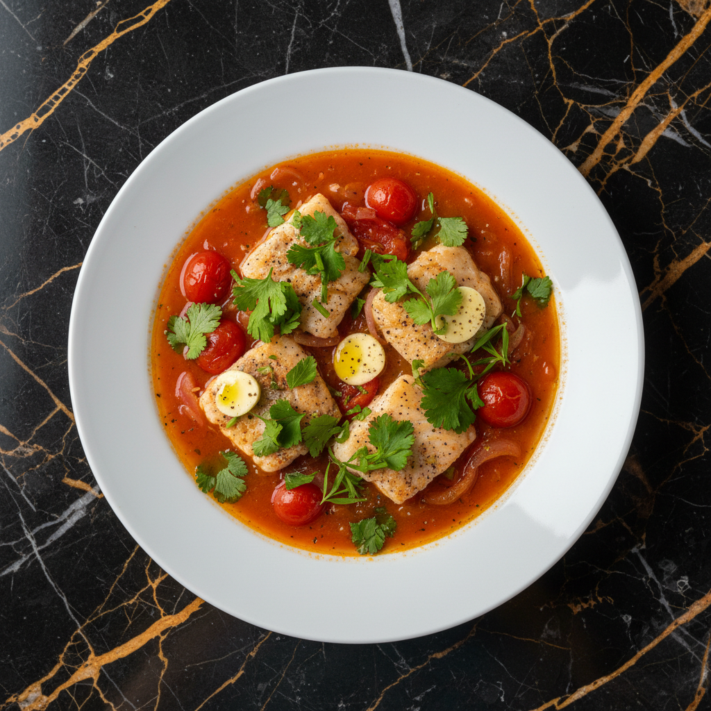 A light yet flavorful fish stew featuring cod fillets simmered in a white wine and tomato broth, infused with a generous amount of fresh herbs like cilantro, parsley, and tarragon. This dish highlights the Georgian love for fresh ingredients and aromatic herbs.