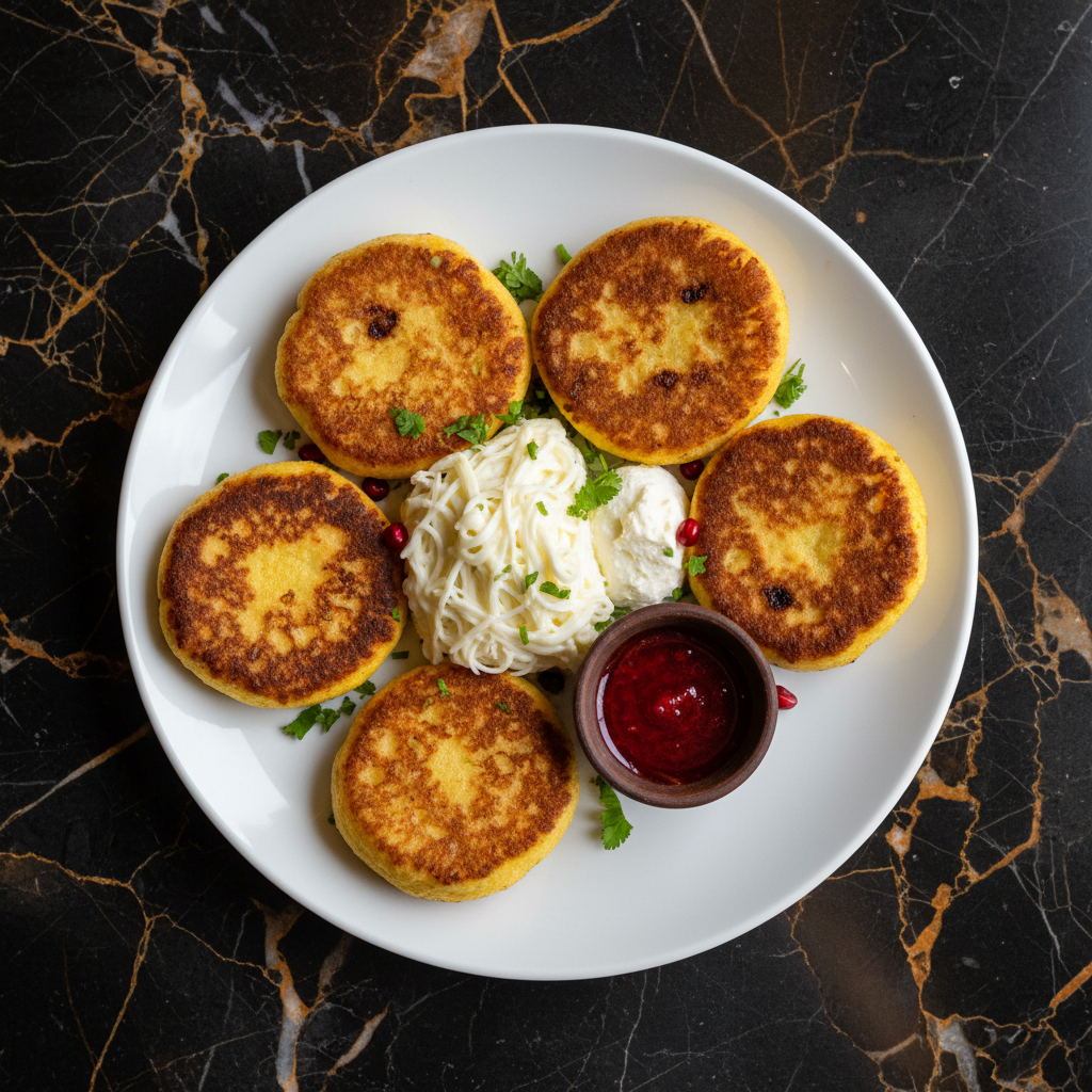 Mchadi are traditional Georgian cornbread patties, often made with cornmeal, water, and salt, then pan-fried until golden brown and slightly crispy. They are a staple, especially in western Georgia, and are commonly served with cheese or as a side dish.
