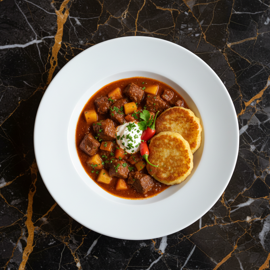 A hearty and comforting German take on the classic Hungarian goulash, featuring tender beef simmered in a rich, paprika-infused sauce. This version is known for its generous amount of liquid, making it perfect served over egg noodles.