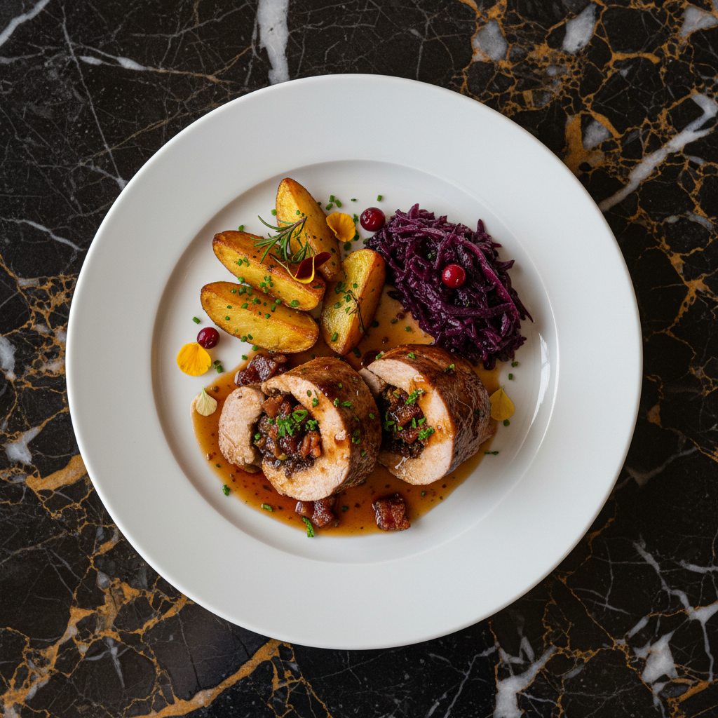 A succulent pork tenderloin stuffed with a savory-sweet mixture of apple syrup, bacon, and herbs, then roasted to perfection. This dish offers a delightful balance of flavors and textures, making it a festive main course.