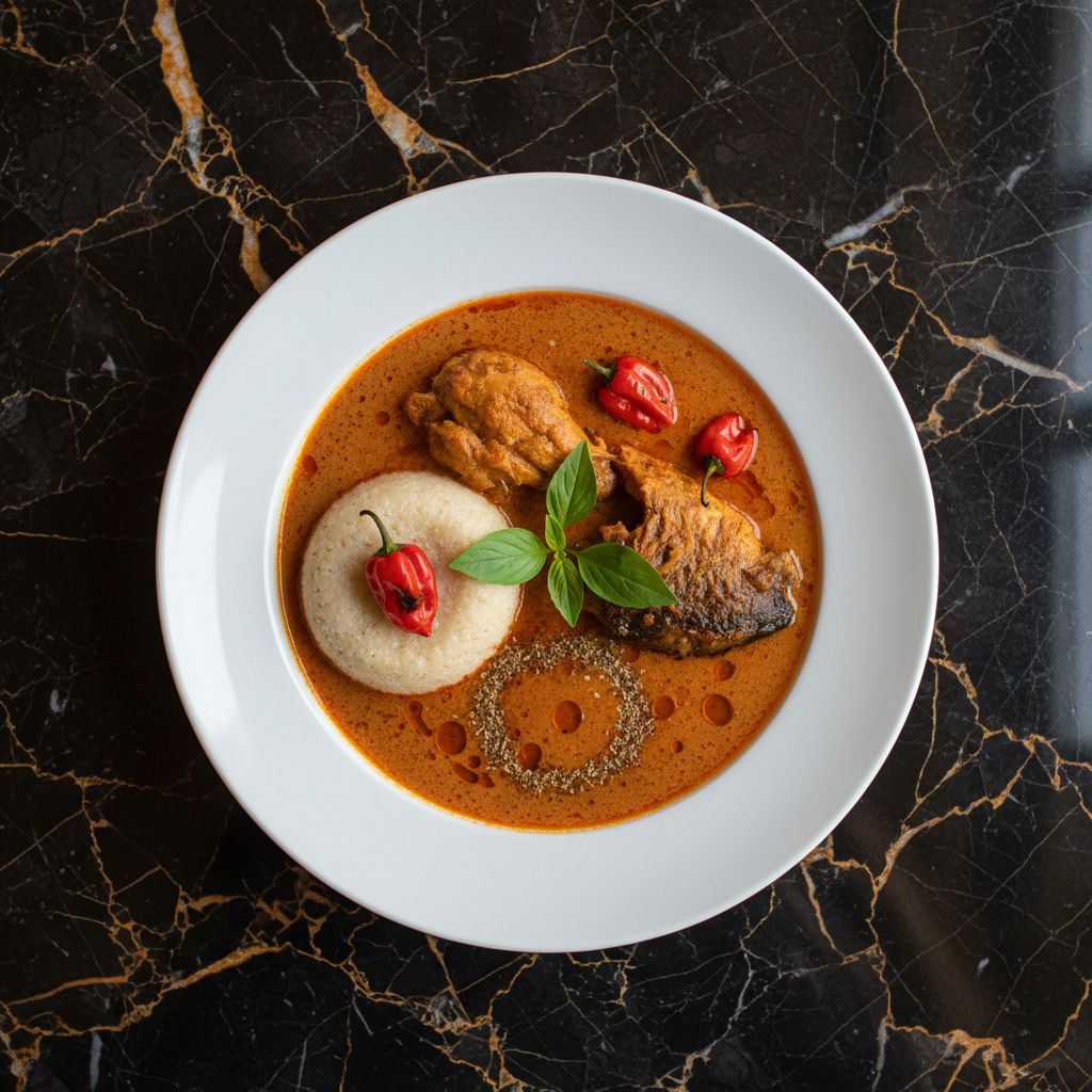 A rich and flavorful West African soup made from palm nut cream, often simmered with various proteins like chicken, goat meat, or smoked fish. It's a staple in Ghanaian cuisine, known for its creamy texture and savory depth.