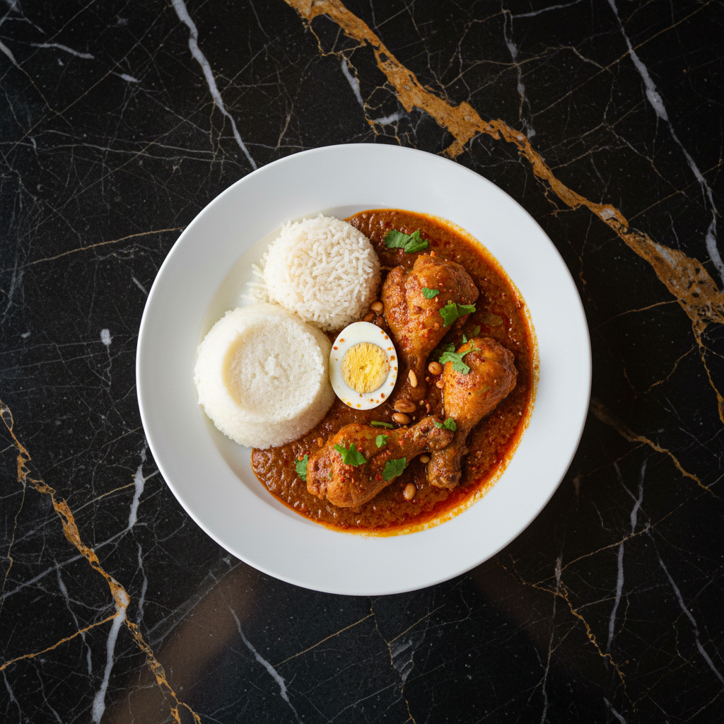 A rich and flavorful stew made with chicken, groundnut paste, tomatoes, and aromatic spices, often served with rice or fufu. This version focuses on a smoother, more integrated sauce.