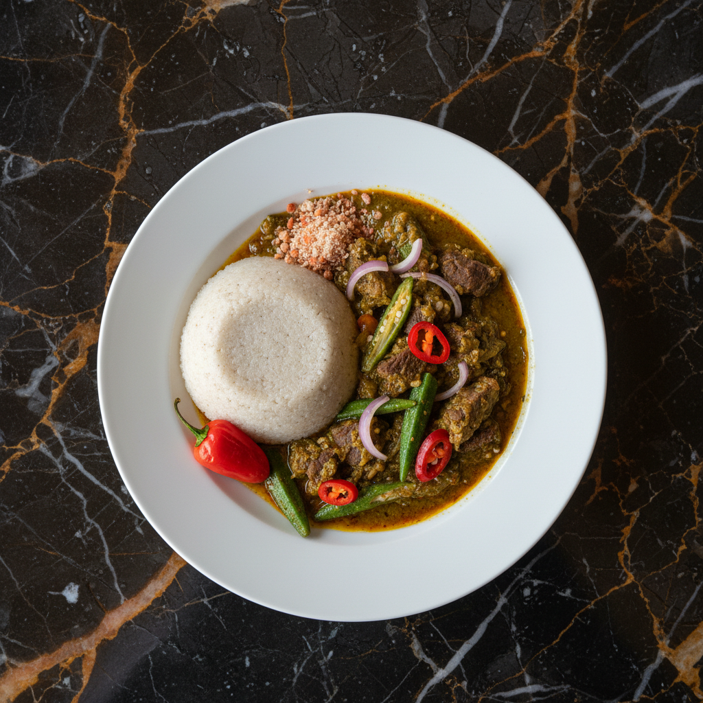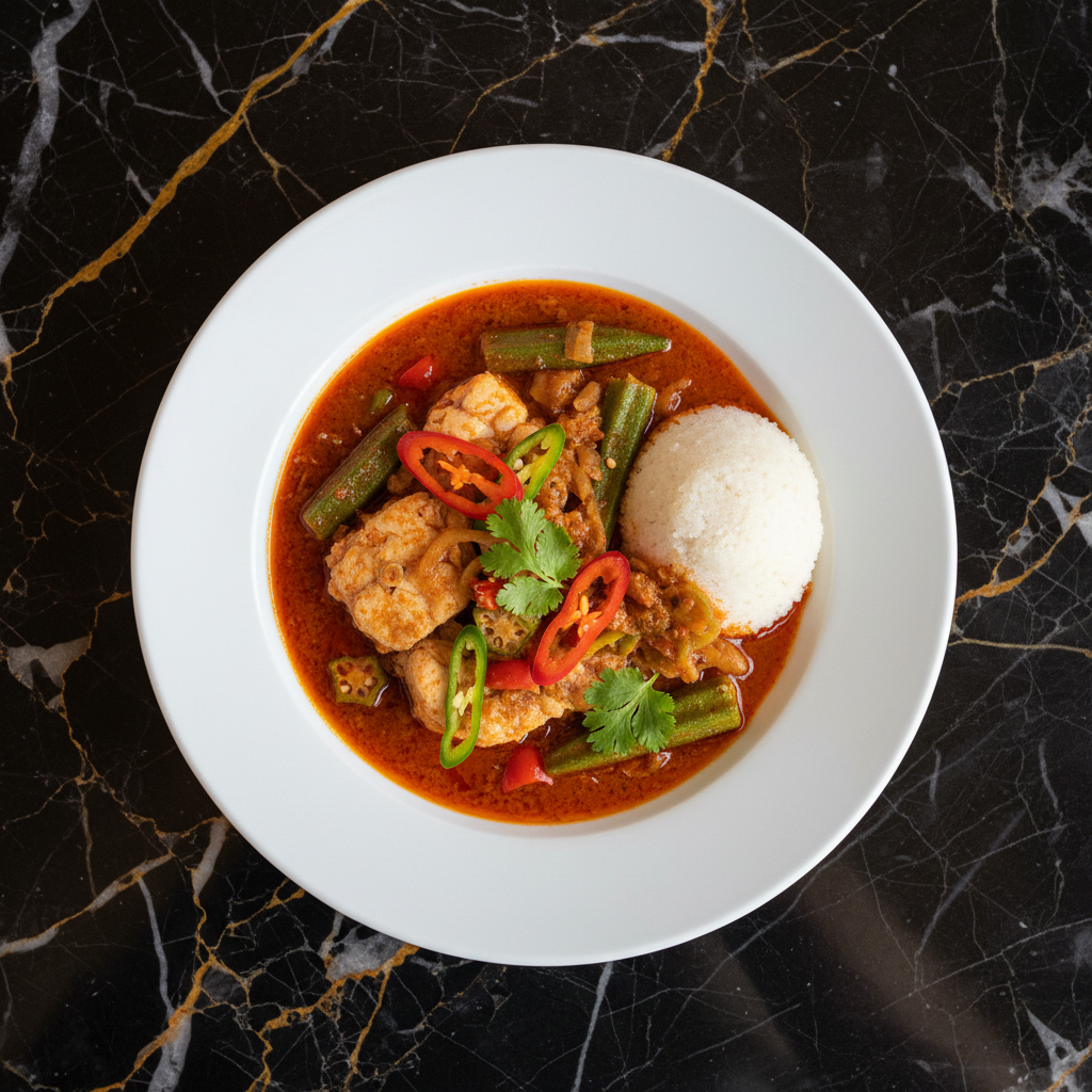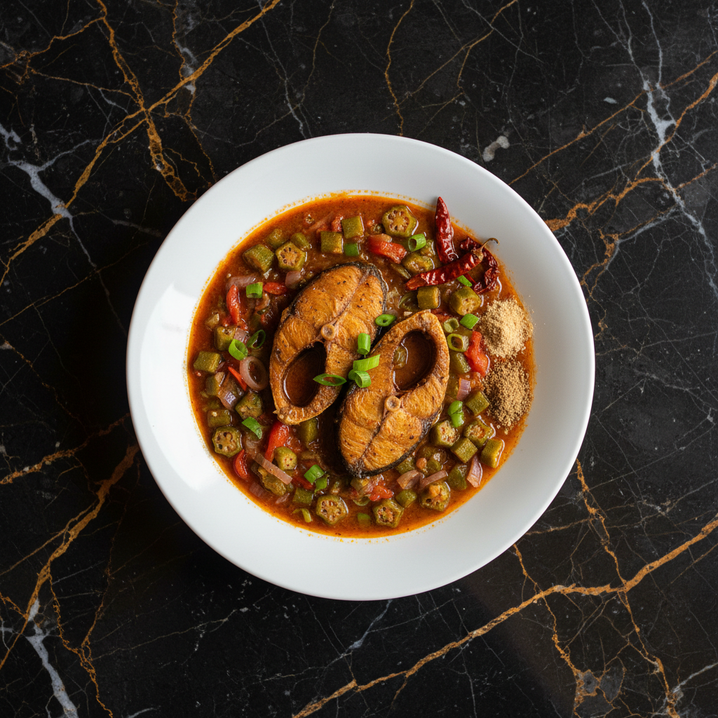 Fetri Detsi, a traditional Ewe dish from the Volta Region of Ghana, is a flavorful okra soup often prepared without oil, highlighting the natural flavors of its ingredients. This version features smoked tilapia, adding a deep, savory dimension to the okra and a medley of aromatic spices.
