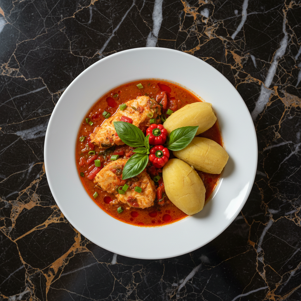 A flavorful and comforting stew featuring tender pieces of fish simmered in a rich tomato-based sauce with aromatic spices, served alongside soft boiled yam.