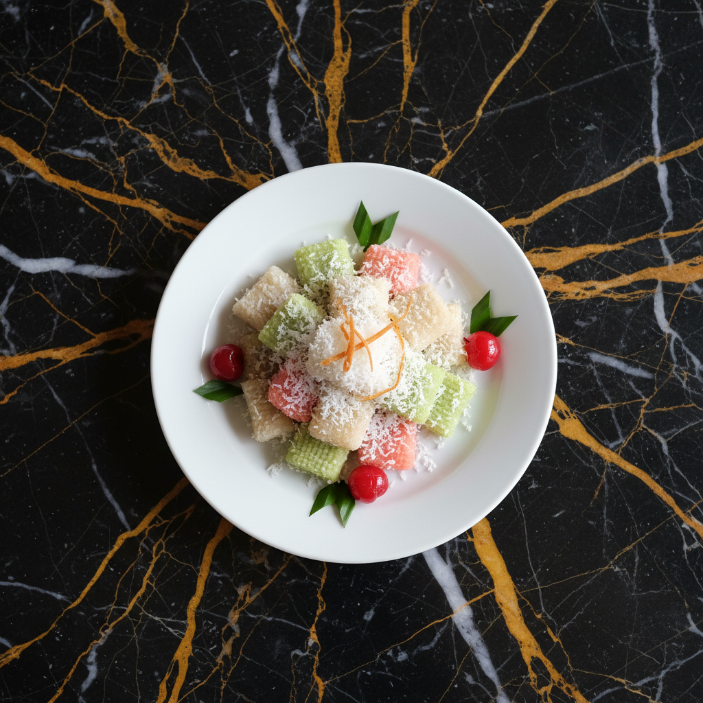 Getuk is a traditional Indonesian sweet snack made from mashed cassava, sweetened with sugar, and coated in grated coconut. It's a simple yet delicious treat, often enjoyed as a dessert or snack.