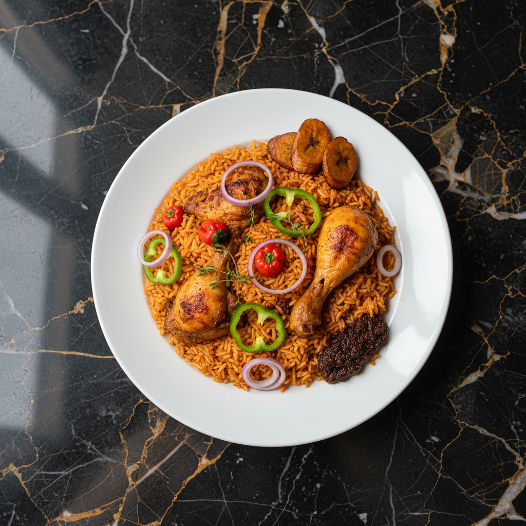 A flavorful one-pot rice dish cooked in a rich tomato and pepper sauce, often served with tender chicken. This version focuses on the Ghanaian preparation style.