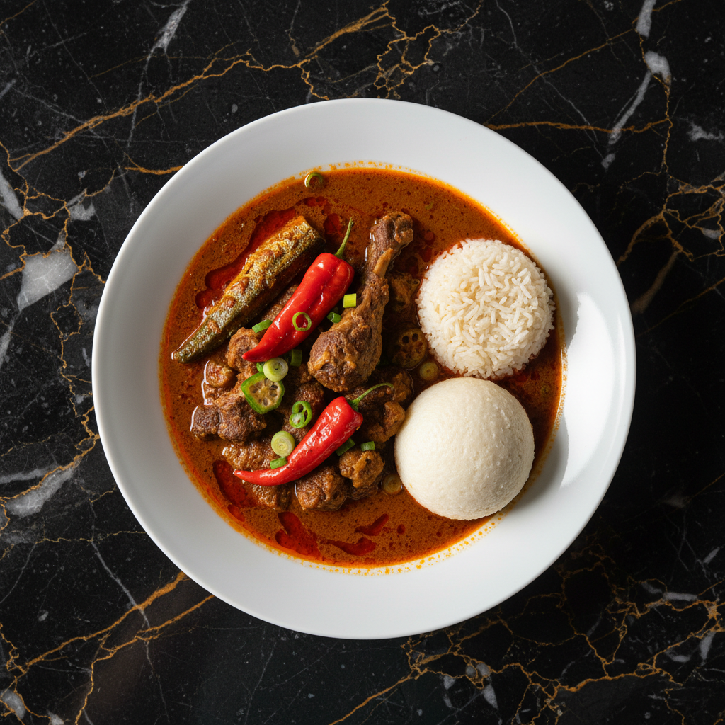 A rich and flavorful soup made from the pulp of palm nuts, often enjoyed with fufu or rice balls. This version focuses on a hearty, meat-inclusive preparation.