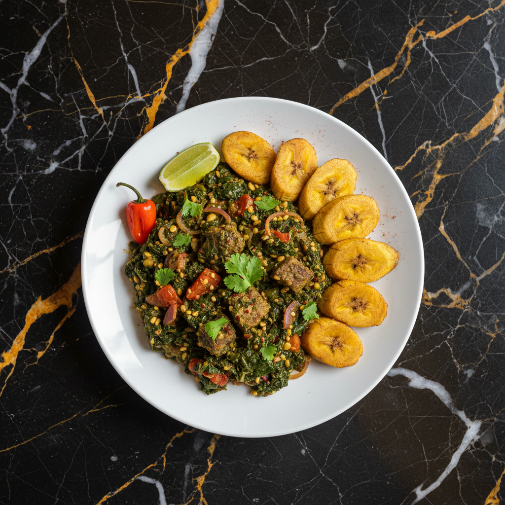 A nutrient-rich and flavorful stew made with spinach (or cocoyam leaves), often thickened with egusi (ground melon seeds). It's typically seasoned with tomatoes, onions, garlic, ginger, and peppers, and served with boiled ripe plantains for a complete meal.