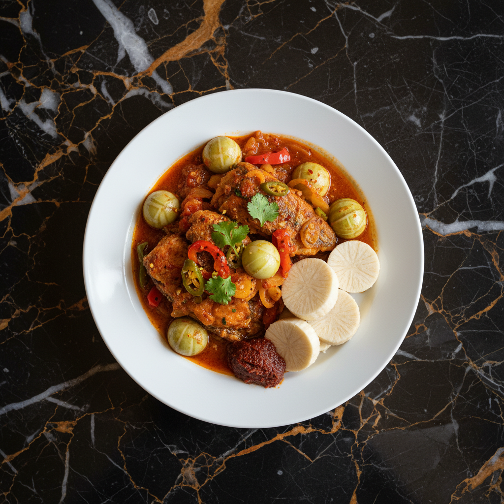 A flavorful and aromatic stew featuring tilapia fish simmered in a rich tomato-based sauce with garden eggs (a type of small eggplant). This dish is a delightful blend of spice and savory notes, often enjoyed with boiled yam or plantain.