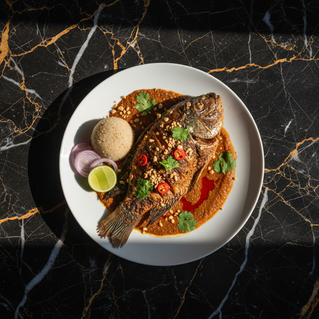 Whole tilapia, often grilled or fried until crispy, served with a rich and savory groundnut (peanut) sauce, a staple in Ghanaian cuisine.
