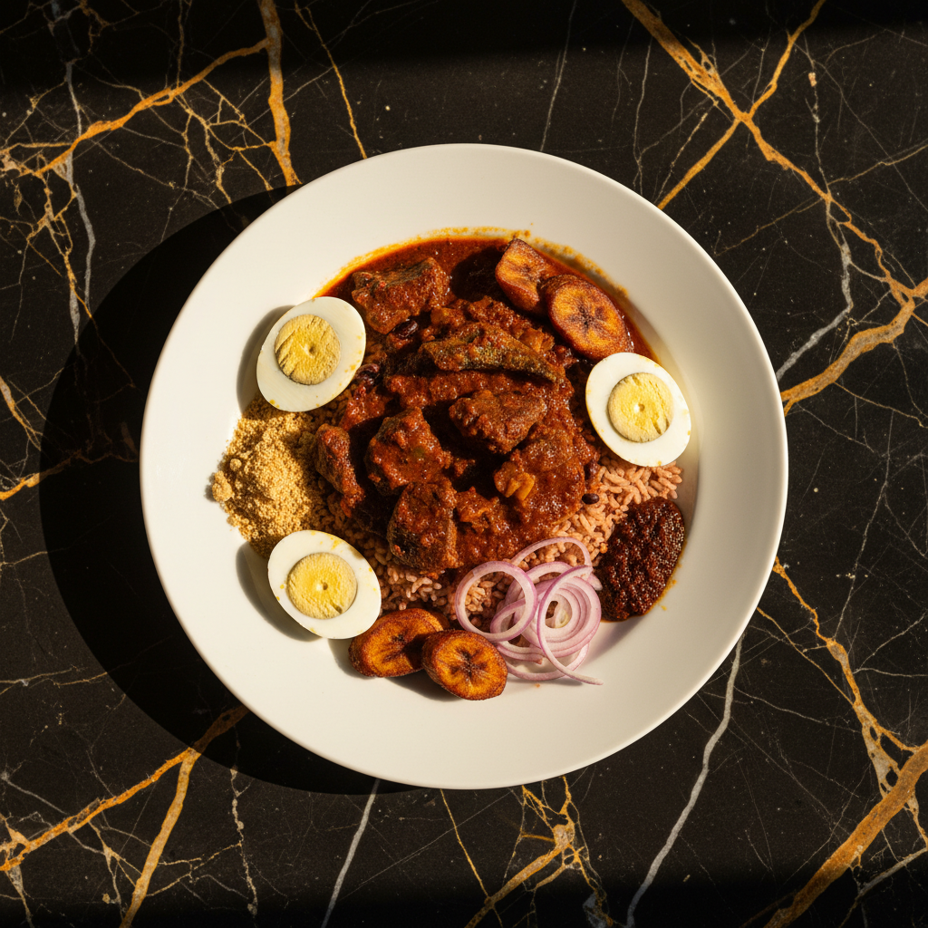 A rich and flavorful stew often served with Waakye (rice and beans), this dish features a base of tomatoes, onions, and spices, simmered with meat or fish for a hearty meal.