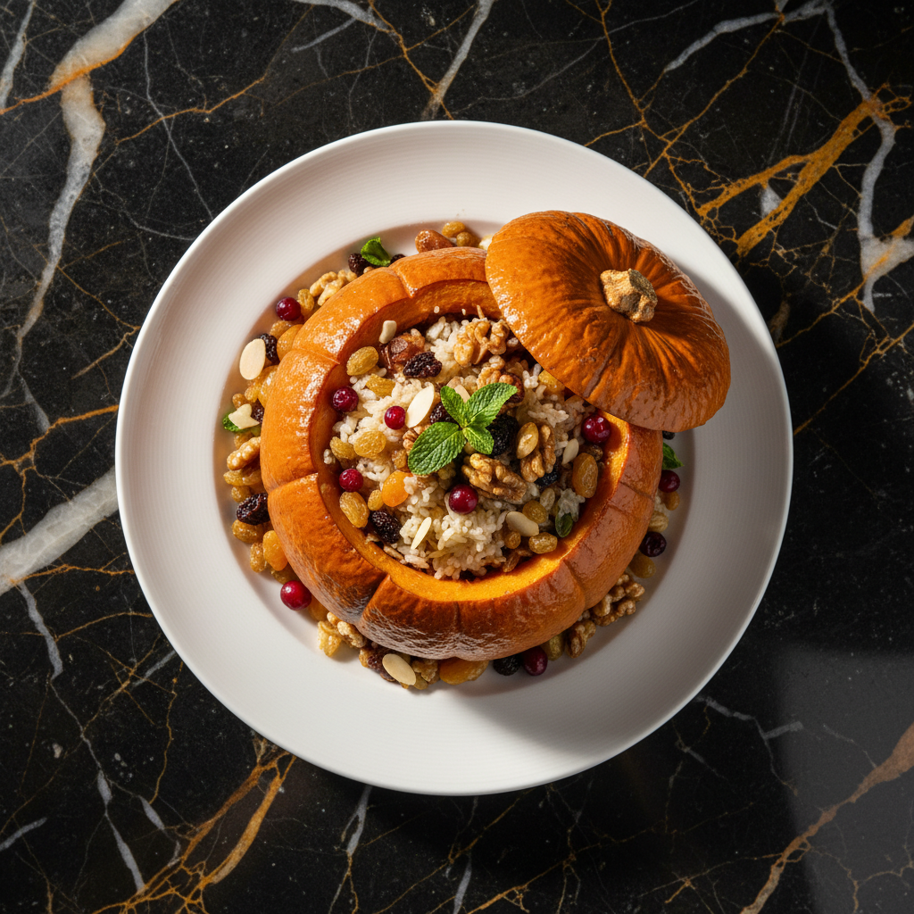 A traditional Armenian pumpkin dish, often prepared for holidays and special occasions. It's a baked pumpkin stuffed with rice, dried fruits, nuts, and sweetened with honey or sugar.