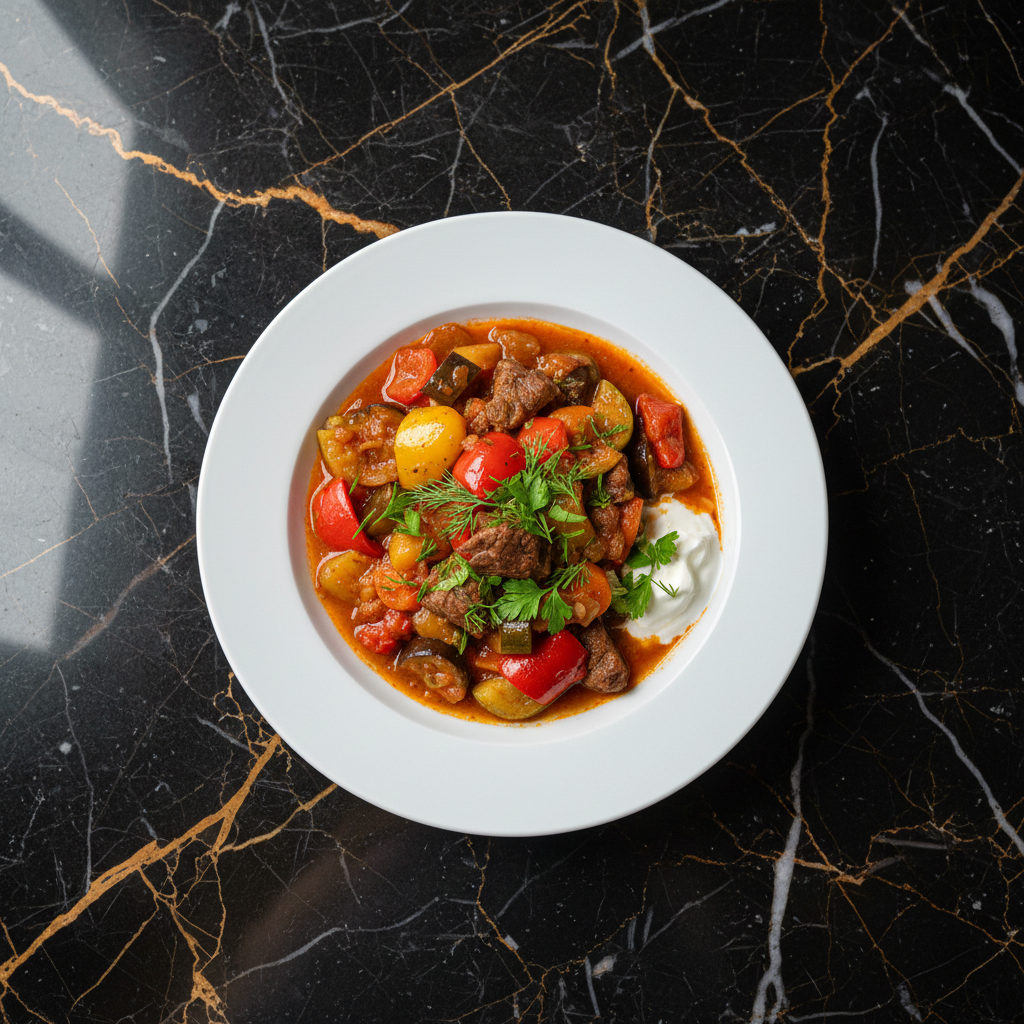 A hearty and flavorful Moldovan vegetable stew, often enriched with meat, showcasing a rich blend of seasonal produce and aromatic herbs.
