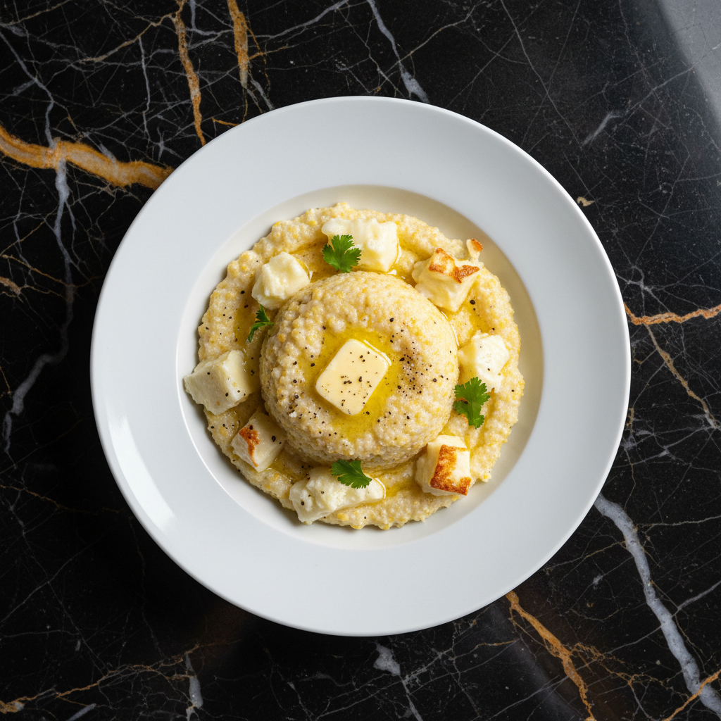 Ghomi is a traditional porridge from the Samegrelo region of Georgia, made primarily from coarse cornmeal and water. It has a thick, polenta-like consistency and is traditionally served hot, topped with strips of melting Sulguni cheese and butter.