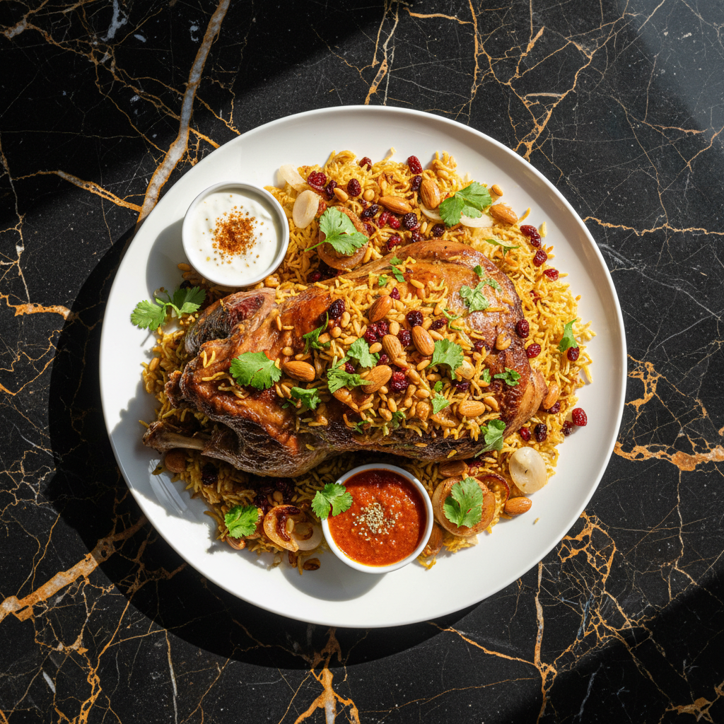 A celebratory dish featuring a whole roasted lamb or goat, often stuffed with rice and spices. It's a centerpiece for feasts and gatherings, known for its tender meat and aromatic rice filling.