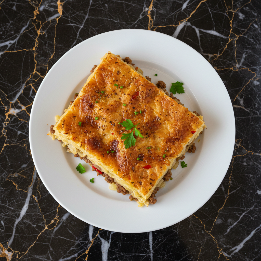 A savory Serbian pie made with layers of thin phyllo dough filled with a mixture of ground meat, onions, and spices. It's a hearty and flavorful dish perfect for any meal.
