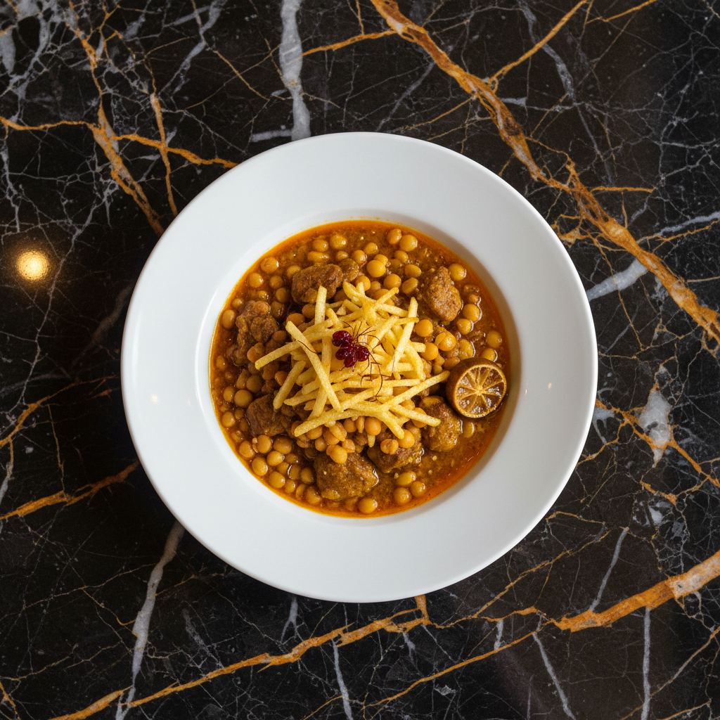A classic and comforting Persian khoresh (stew) made with tender lamb, yellow split peas, and the unique tangy flavor of dried limes. Traditionally topped with crispy shoestring potatoes (French fries).