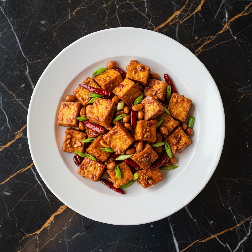 A vegetarian twist on the classic Sichuan Kung Pao dish, featuring crispy pan-fried tofu coated in a savory, spicy, and slightly sweet sauce, studded with crunchy peanuts and aromatic chilies.