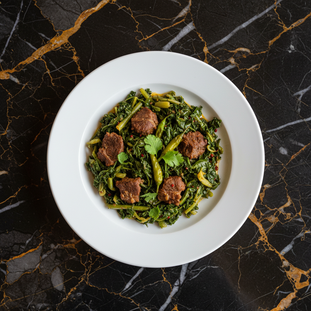 A hearty and flavorful Ethiopian stew featuring tender collard greens simmered with succulent beef, infused with the aromatic spice blend of niter kibbeh (spiced clarified butter). This is a non-fasting version.