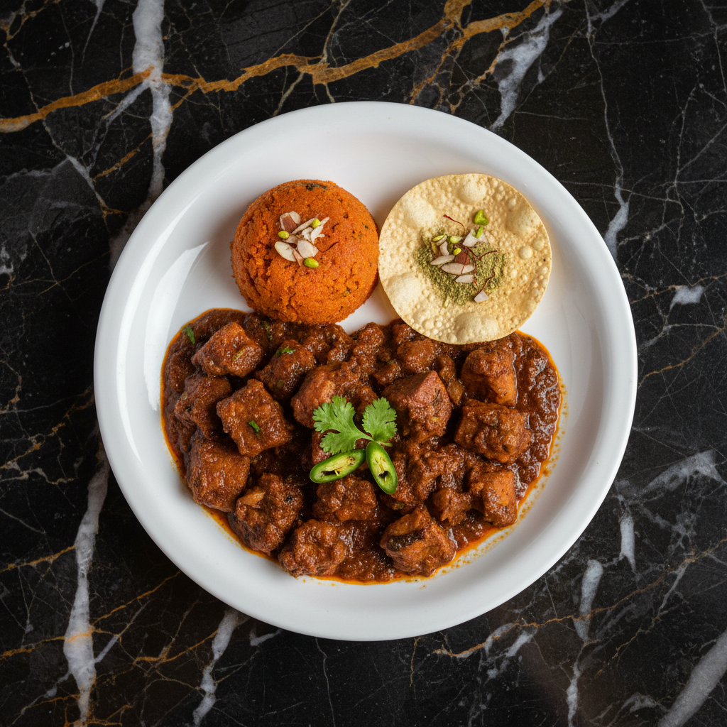 Goan Sorpotel is a rich, tangy, and spicy pork dish, a beloved legacy of Portuguese influence in Goa. Traditionally made with a variety of pork cuts and offal, it's slow-cooked in a vibrant masala of vinegar, chilies, and aromatic spices. Its distinctive sourness and heat, combined with the tender pork, make it a celebratory dish, often prepared for feasts and special occasions. Sorpotel is known for its long shelf life, traditionally preserved in vinegar.