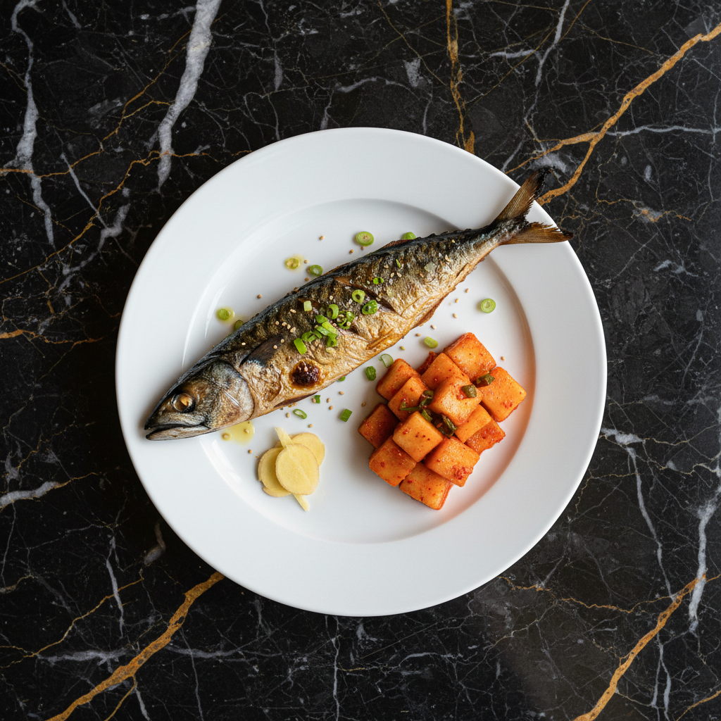 Godeungeo Gui (Grilled Mackerel) with Radish Kimchi