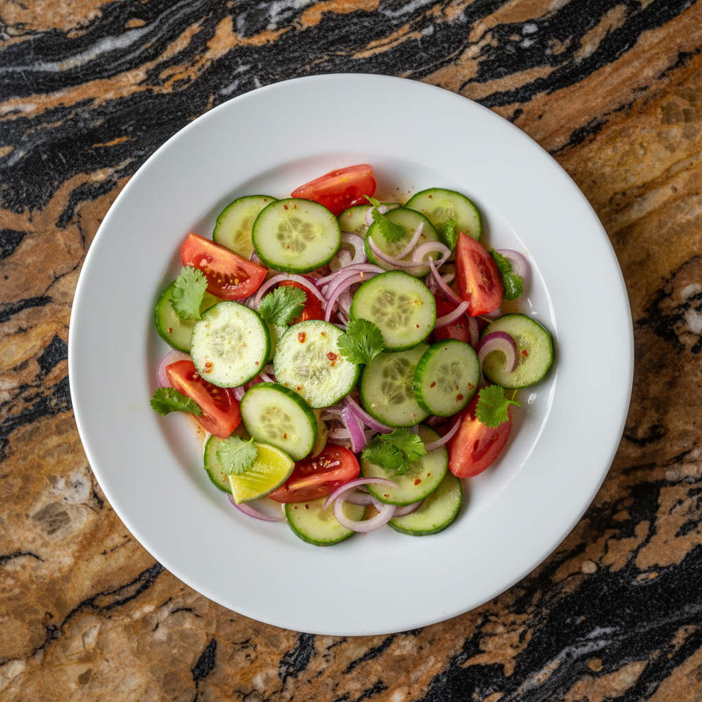 A refreshing and vibrant Bhutanese cucumber salad, Goen Hogay, meaning 'cucumber salad' in Dzongkha, is a delightful mix of crisp cucumbers, juicy tomatoes, and sharp red onions. It's dressed with a zesty combination of lime juice, fresh coriander, and a hint of chili for a subtle kick.