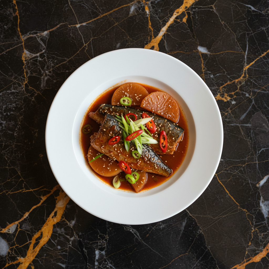 A comforting and flavorful Korean dish where mackerel fillets are gently braised in a savory and slightly spicy broth with tender radish. This recipe is a staple in Korean home cooking, perfect served with steamed rice.