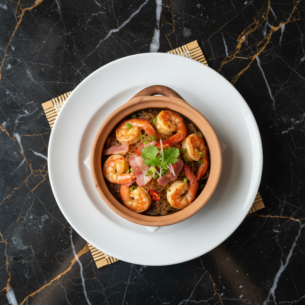 A classic Thai dish featuring succulent prawns and slippery glass noodles baked together in a clay pot, infused with aromatic ginger, coriander root, and the savory richness of bacon. The result is a comforting and flavorful one-pot meal.