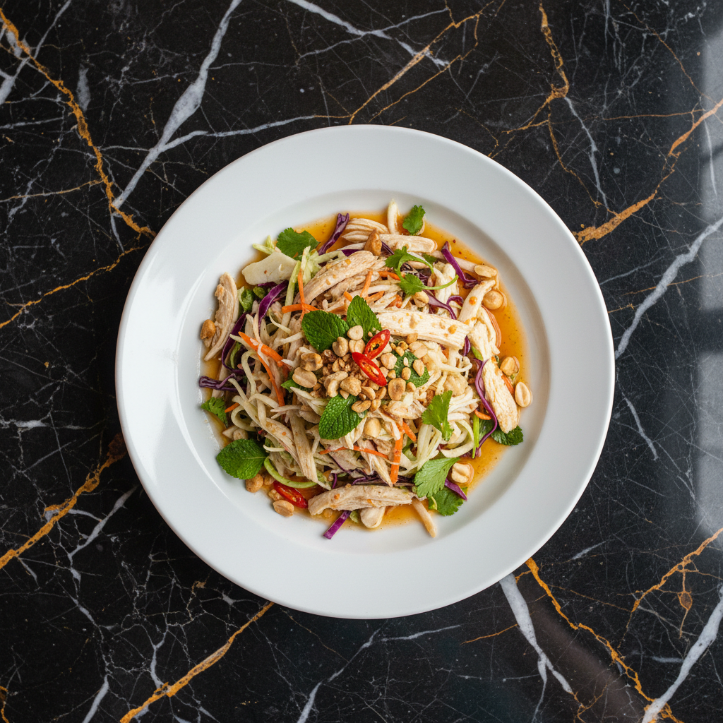 A vibrant and refreshing Vietnamese salad featuring tender shredded chicken and crisp shredded cabbage, tossed in a zesty nuoc cham dressing and garnished with fresh herbs, crunchy peanuts, and crispy fried shallots. Perfect as a light appetizer or a satisfying main course.