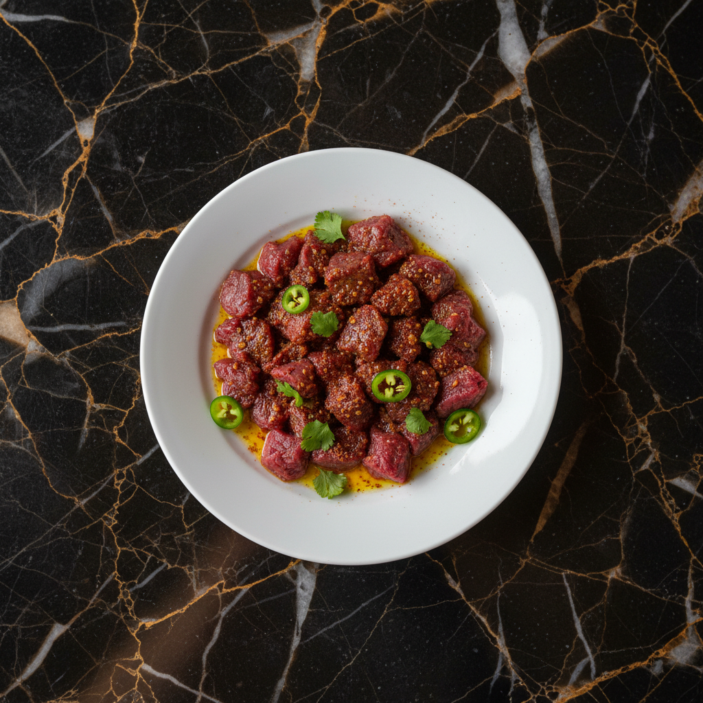 Gored Gored is a celebratory Ethiopian dish featuring cubes of the freshest raw beef tenderloin, marinated in a vibrant and spicy awaze sauce and coated in warm, spiced niter kibbeh. It's traditionally served immediately, allowing the warmth of the butter to slightly temper the raw meat.