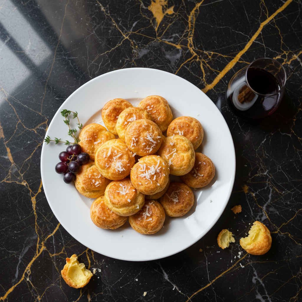 Light and airy French cheese puffs made from pรขte ร choux, flavored with grated cheese. They are typically served as an appetizer or with drinks, and are best enjoyed warm.