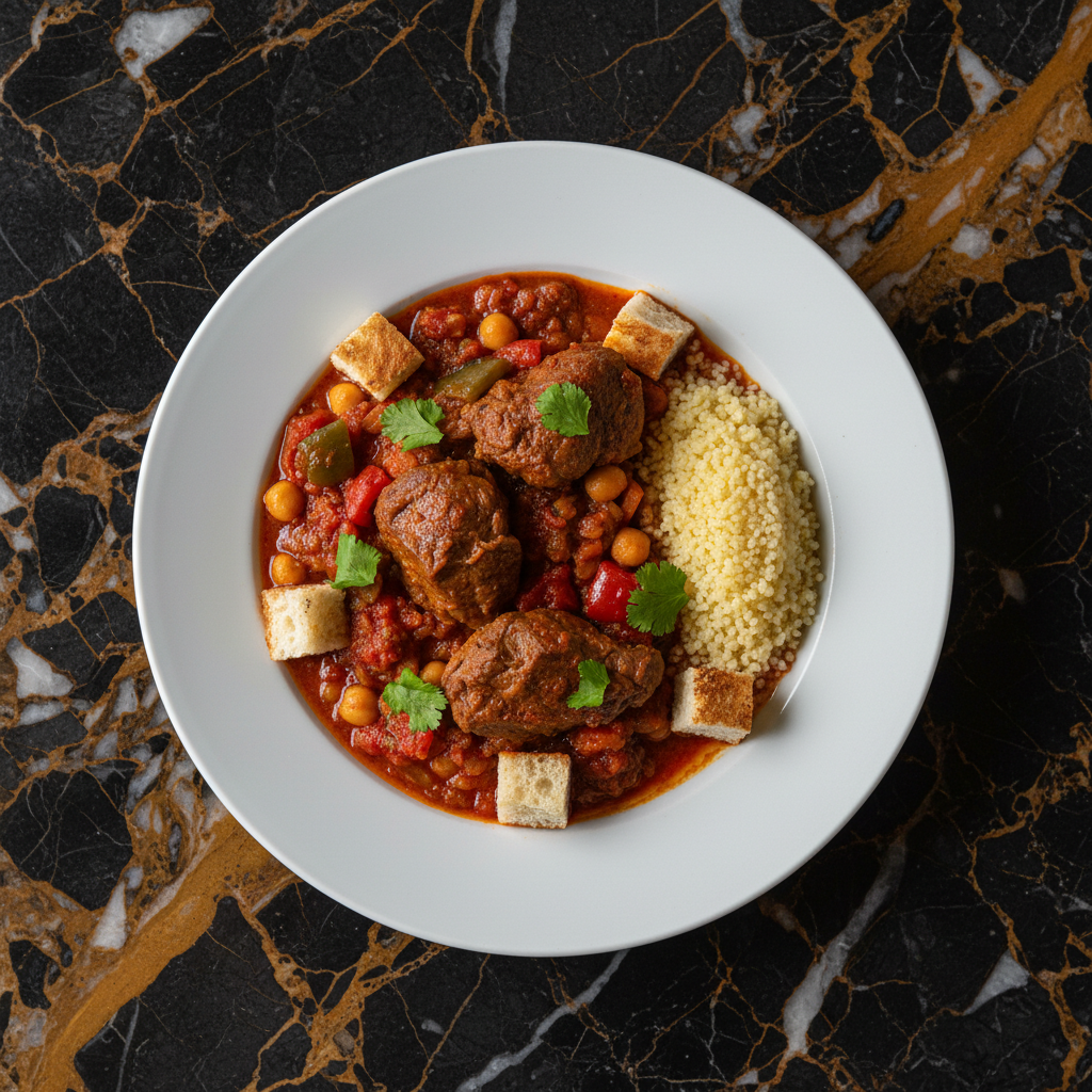 A hearty and flavorful lamb goulash, slow-cooked with aromatic spices, tomatoes, and vegetables until the lamb is meltingly tender. This dish is a comforting staple, often served with bread or couscous.