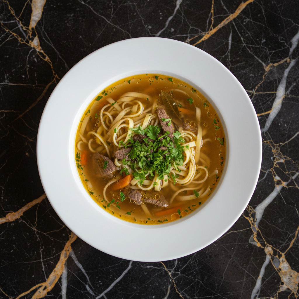 A classic Slovenian beef noodle soup, known for its clear, golden broth and comforting flavors. It's a staple in Slovenian homes, often served as the opening to Sunday lunches.