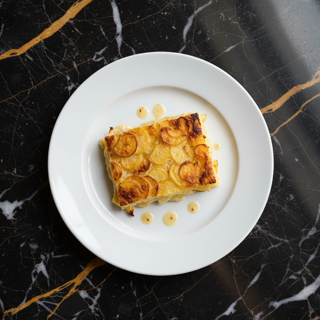 A classic French potato gratin from the Dauphinรฉ region, featuring thinly sliced potatoes baked slowly in a rich mixture of cream and milk until tender and golden brown. This traditional recipe omits cheese, allowing the pure flavors of potato, cream, and a hint of nutmeg to shine.