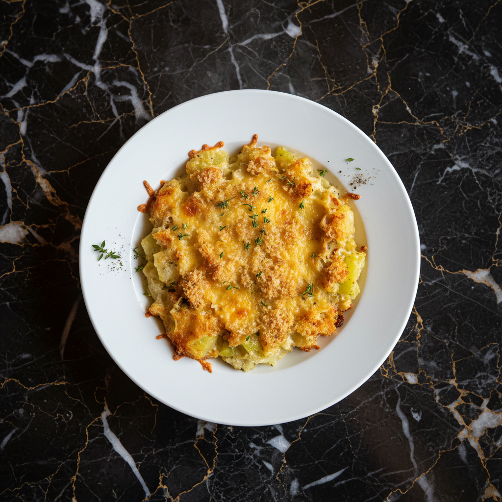 A comforting and creamy baked dish featuring chayote (chouchou) cooked in a bรฉchamel-like sauce, topped with cheese and breadcrumbs for a golden, crispy finish. It's a popular side dish in Mauritian cuisine.