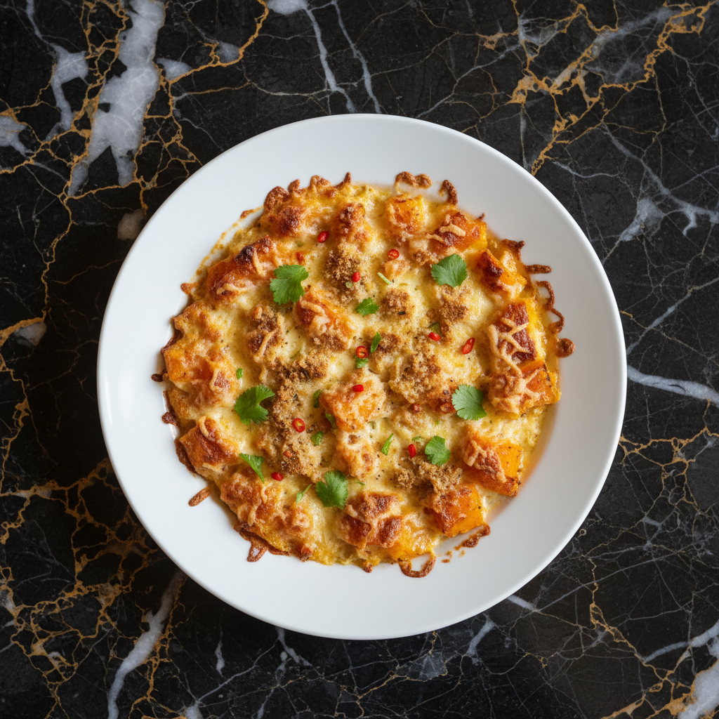 A comforting and flavorful baked dish featuring sweet butternut squash (courge musquรฉe) with a creamy, cheesy topping, often enhanced with local spices.