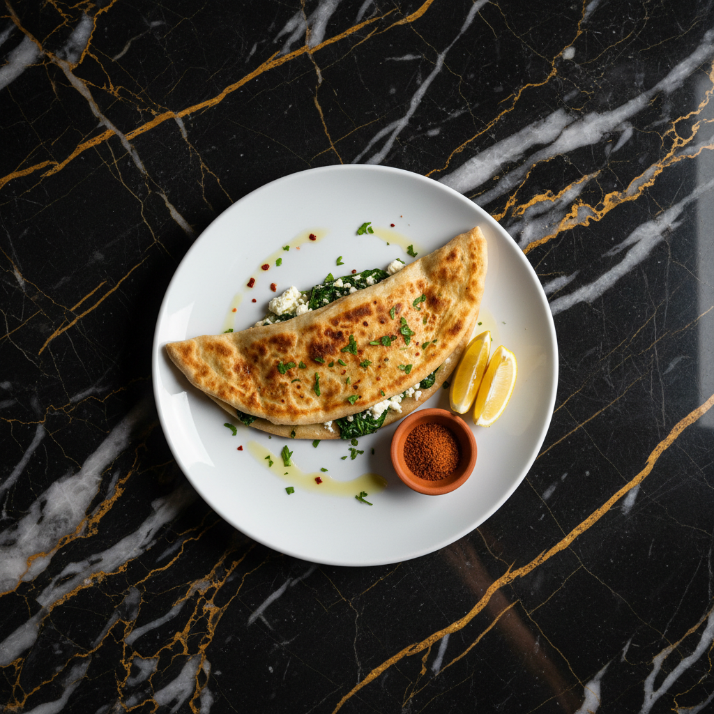 A traditional Turkish savory flatbread, Gรถzleme is made from a thin, unleavened dough filled with various ingredients like spinach and feta cheese, then cooked on a special griddle called a 'sac'. It's a popular and satisfying village breakfast or snack.