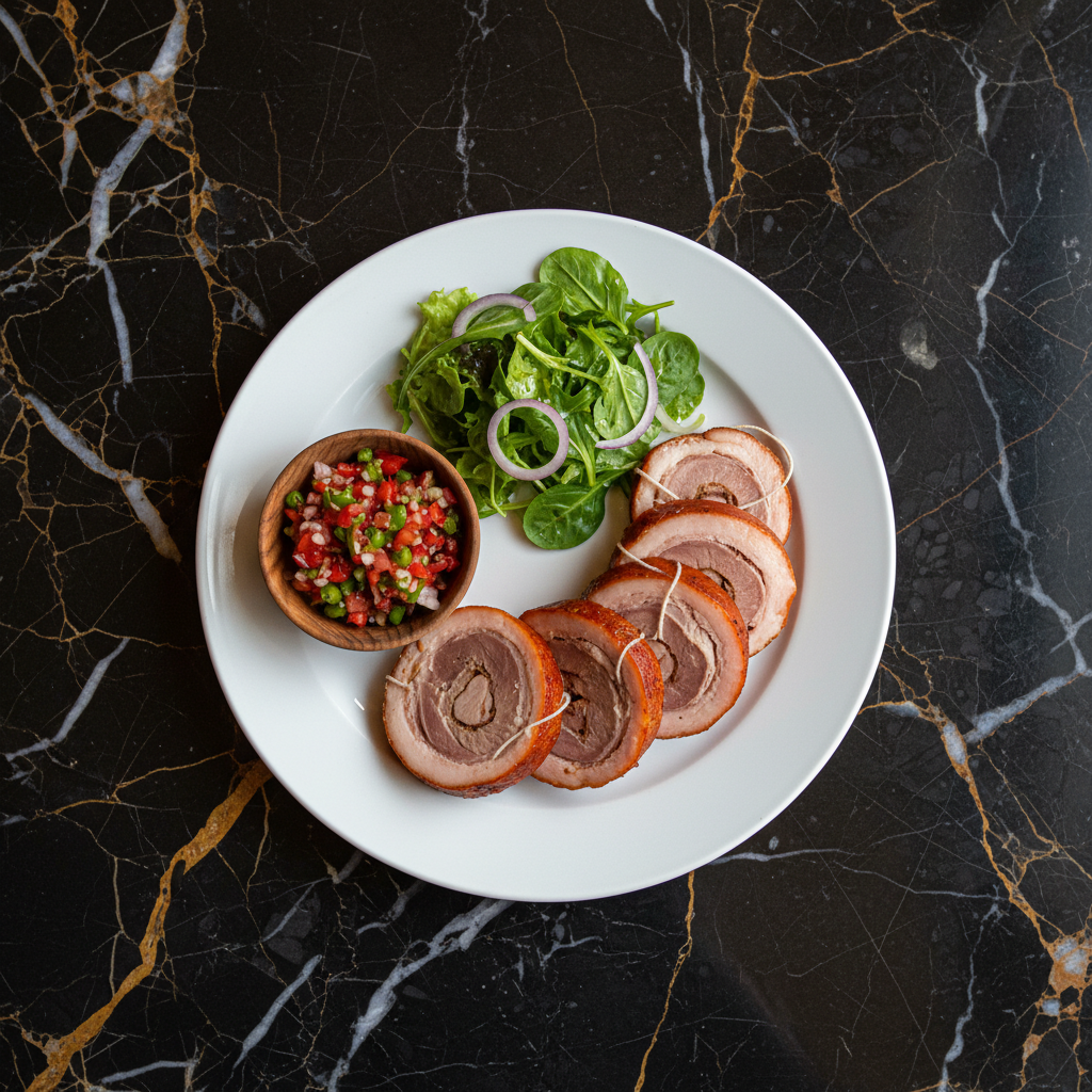 A traditional Chilean rolled pork dish, typically made with pork belly seasoned with spices, rolled, and then boiled or baked. It's often served sliced cold or warm with pebre or a simple salad.