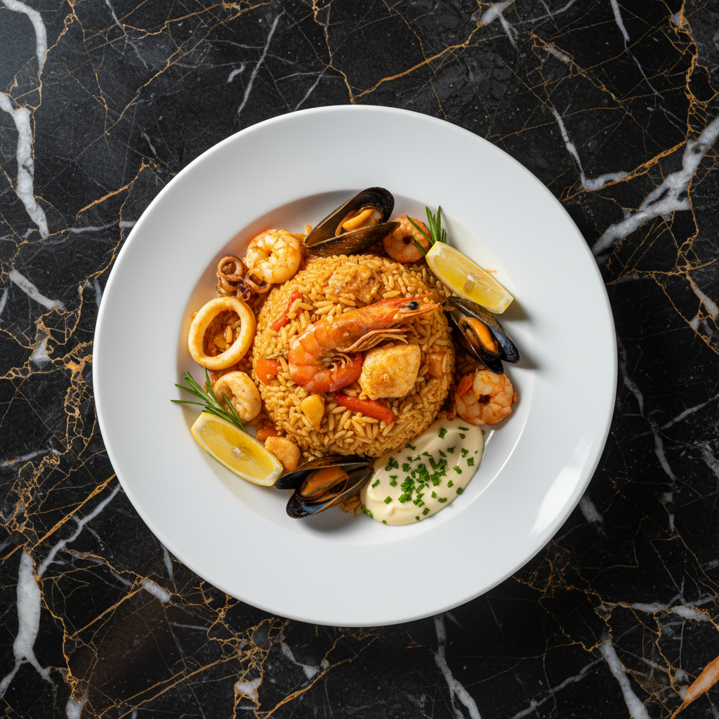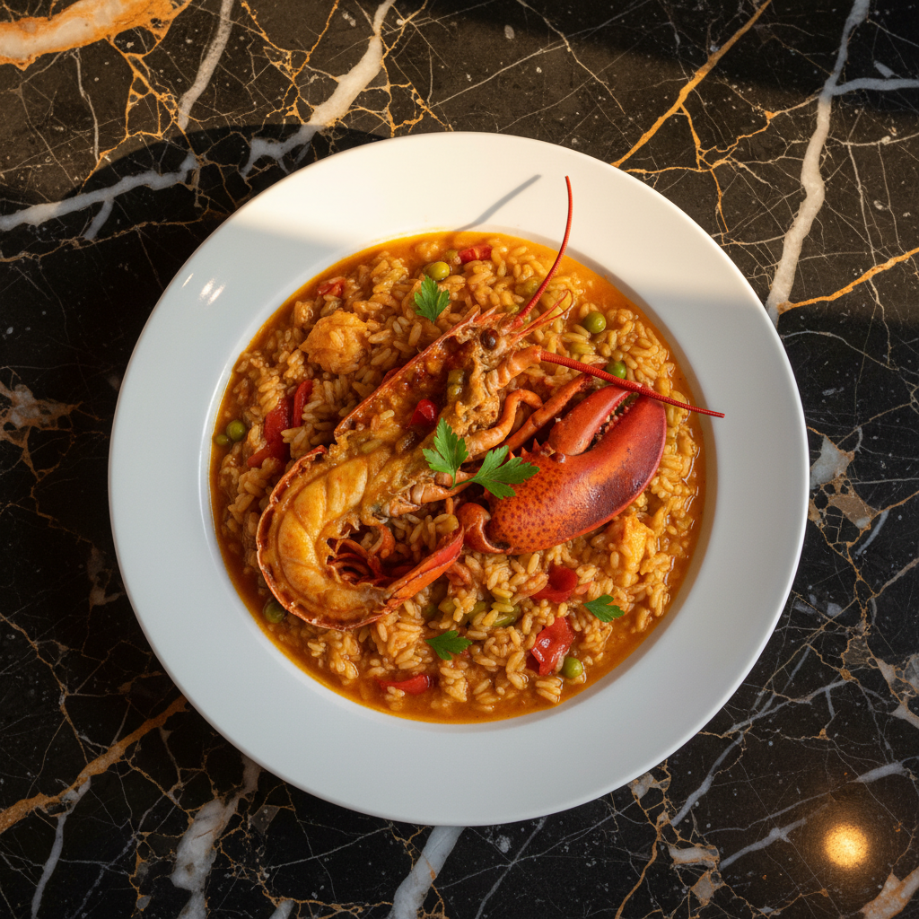 A luxurious Spanish rice dish featuring fresh lobster (bogavante), cooked in a flavorful tomato and saffron broth. It's a celebratory dish often found in coastal areas of Spain.