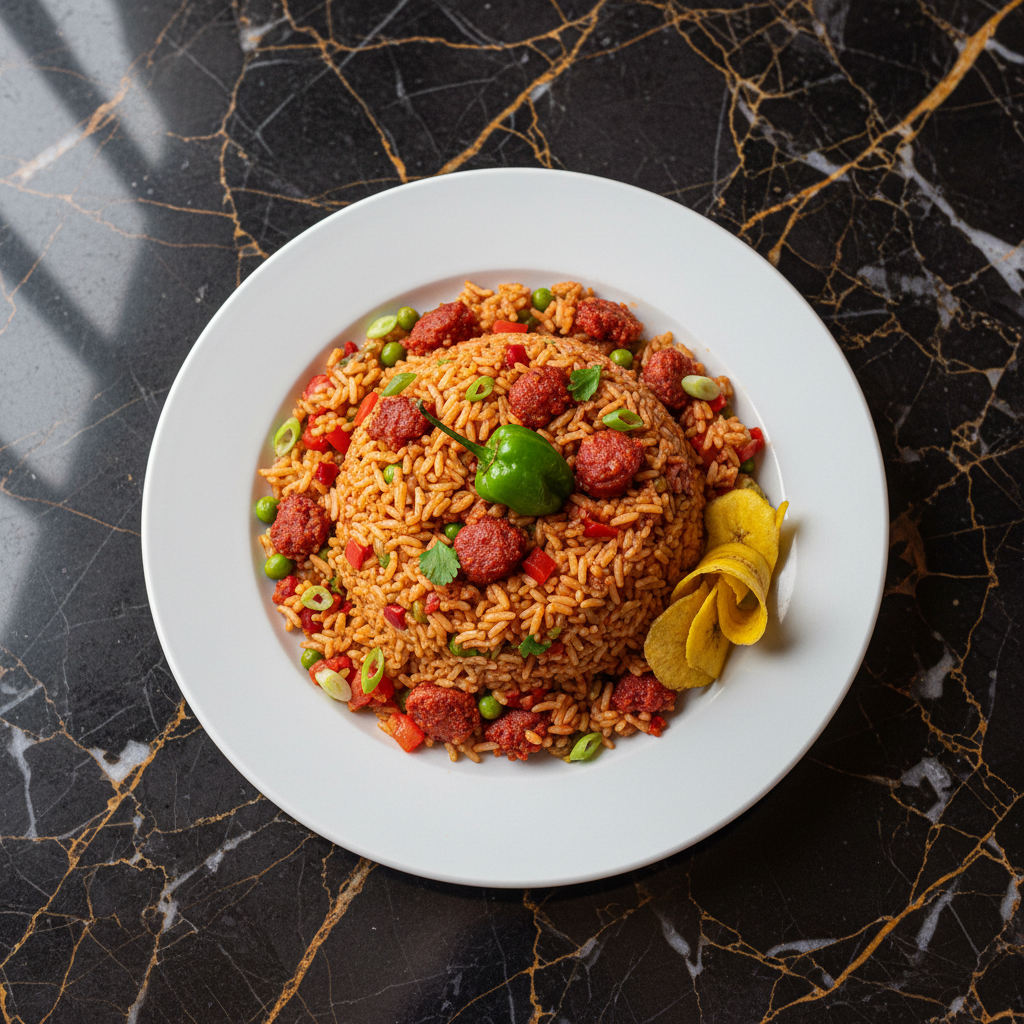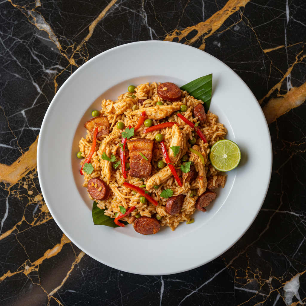 A flavorful Panamanian rice dish featuring the distinct taste of chorizo tableรฑo, a type of sausage from the Azuero Peninsula, combined with rice, vegetables, and aromatic spices.