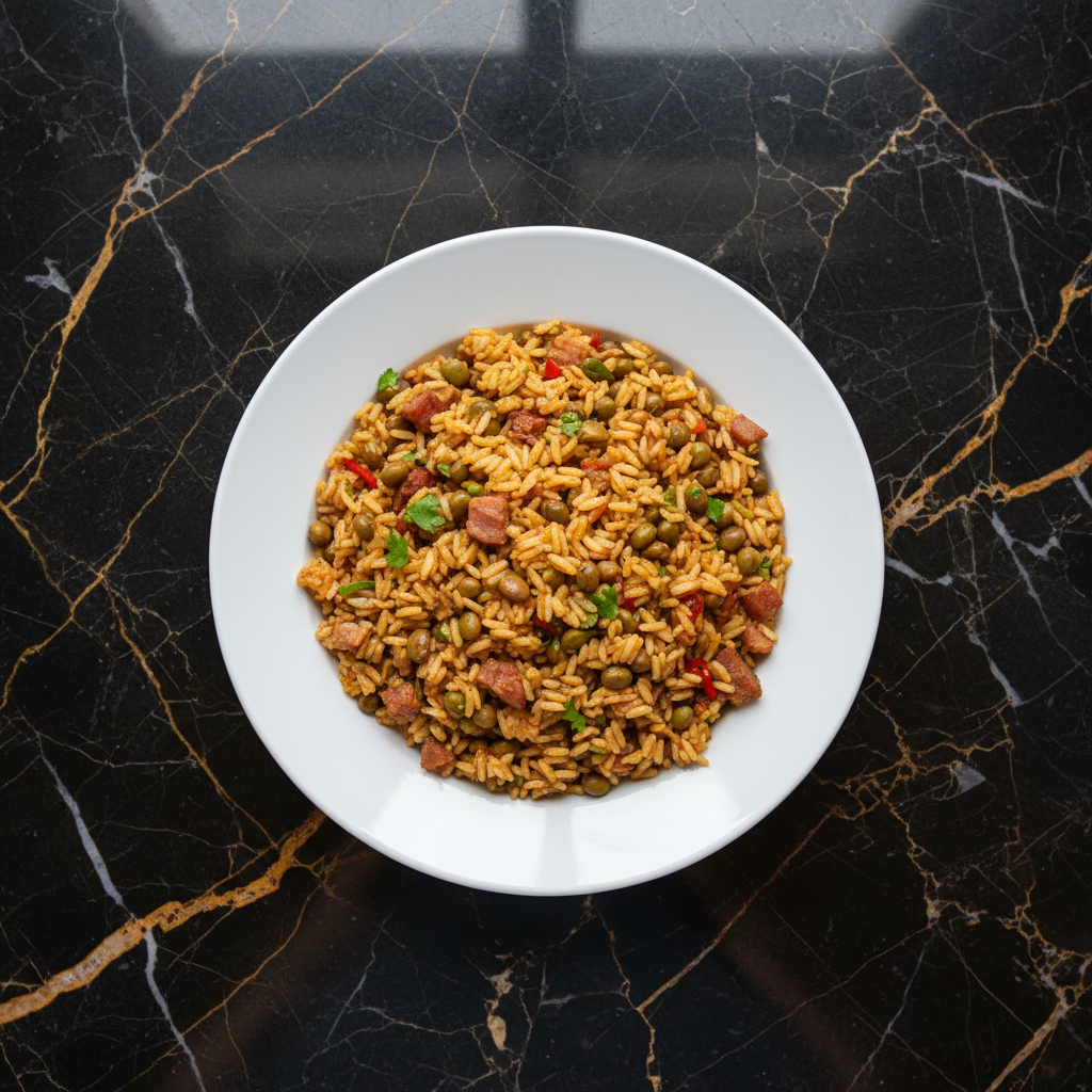 Puerto Rican pigeon pea rice - a flavorful and aromatic rice dish featuring tender pigeon peas, seasoned with sofrito and sazรณn, often cooked with diced pork. A quintessential staple for holiday celebrations and Sunday dinners.
