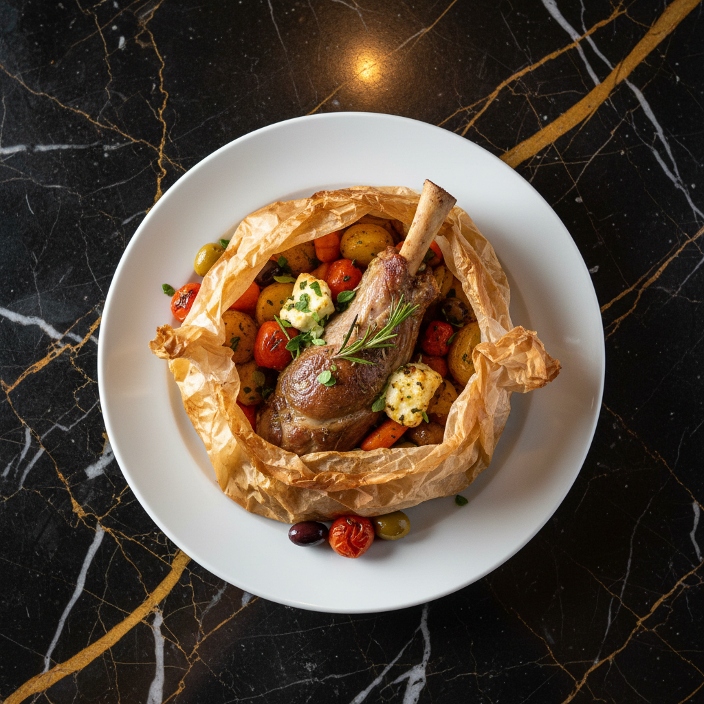 A traditional Greek dish where lamb shoulder is slow-cooked with potatoes, garlic, and lemon, sealed in parchment paper to trap moisture and flavor. The result is incredibly tender, fall-off-the-bone lamb.