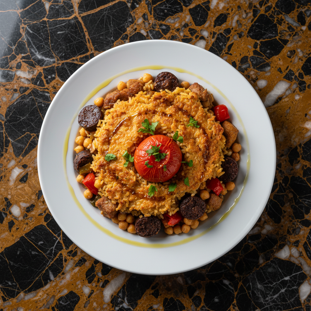 A traditional Valencian dish, Arroz al Horno, meaning 'baked rice', is a hearty and flavorful one-pot meal typically enjoyed on Thursdays. It features rice baked with tender pork ribs, savory morcilla (blood sausage), chickpeas, and a whole head of garlic, resulting in a wonderfully crispy top.