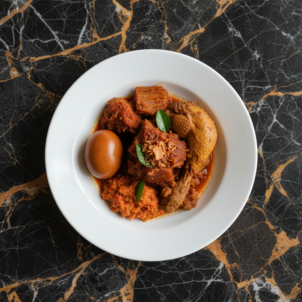 Gudeg is a traditional Javanese sweet stew made from young jackfruit, slow-cooked in coconut milk, palm sugar, and spices. This iconic dish from Yogyakarta is known for its rich, sweet, and savory flavor, and its deep brown color.