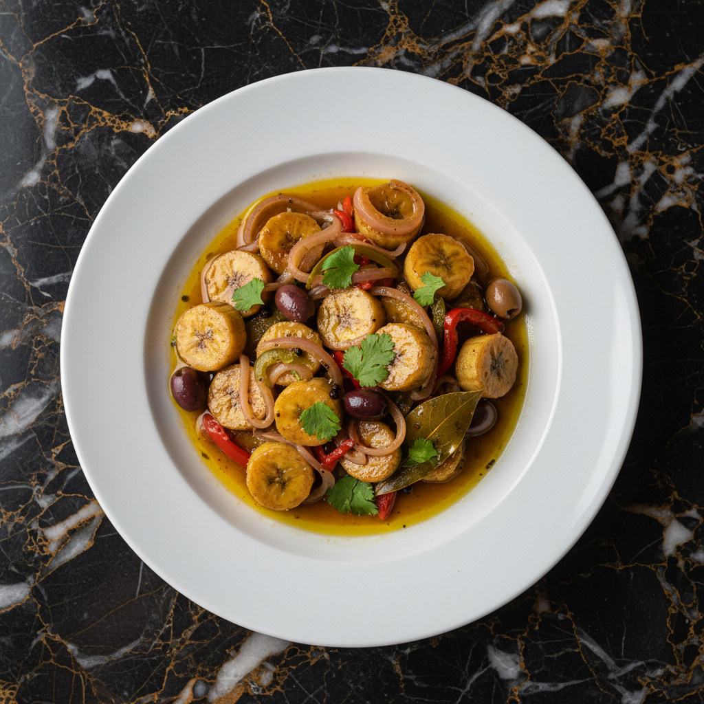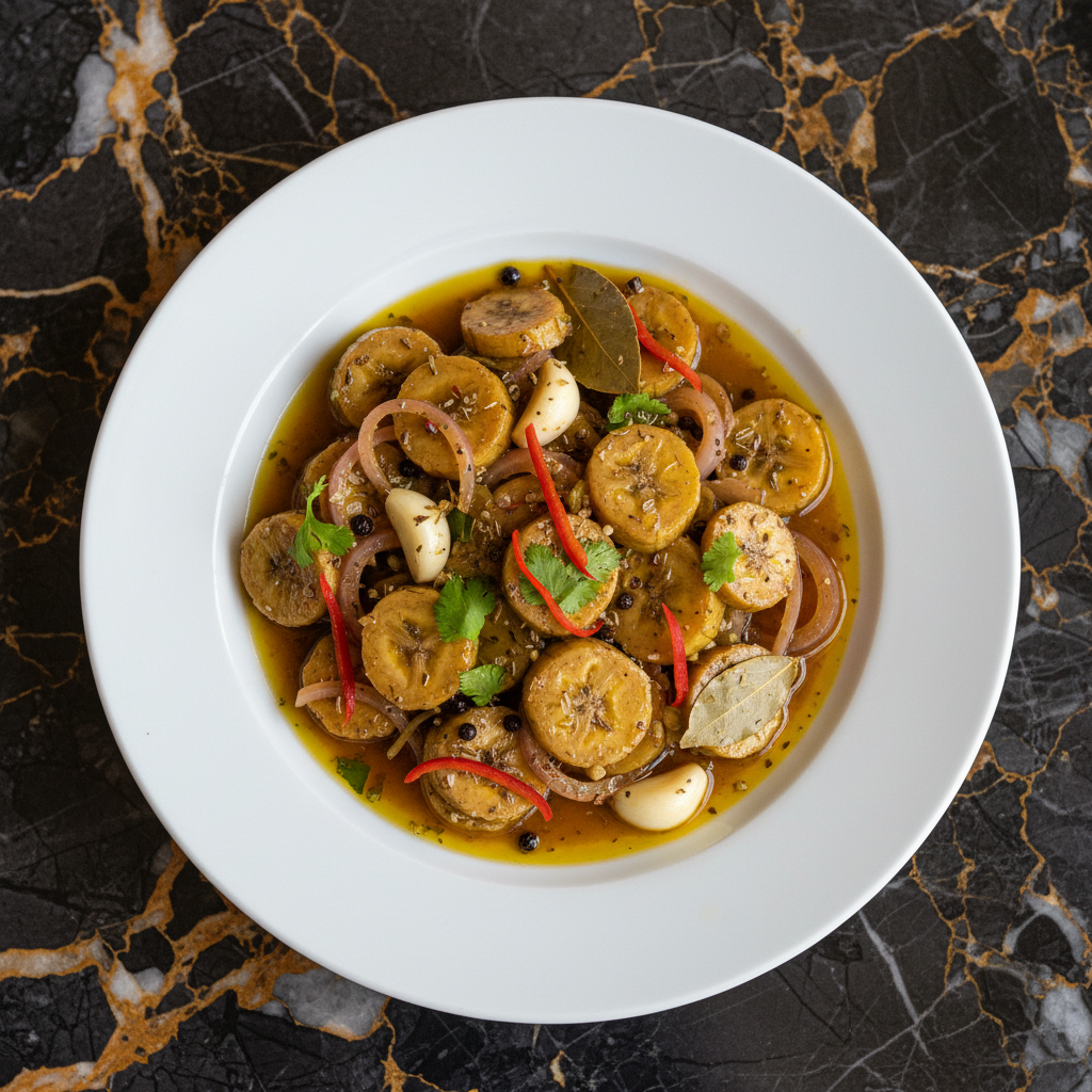 A classic Puerto Rican appetizer or side dish of green bananas (guineos) pickled in a tangy and savory escabeche sauce made with olive oil, vinegar, onions, garlic, and spices. It's a refreshing dish with a unique texture.