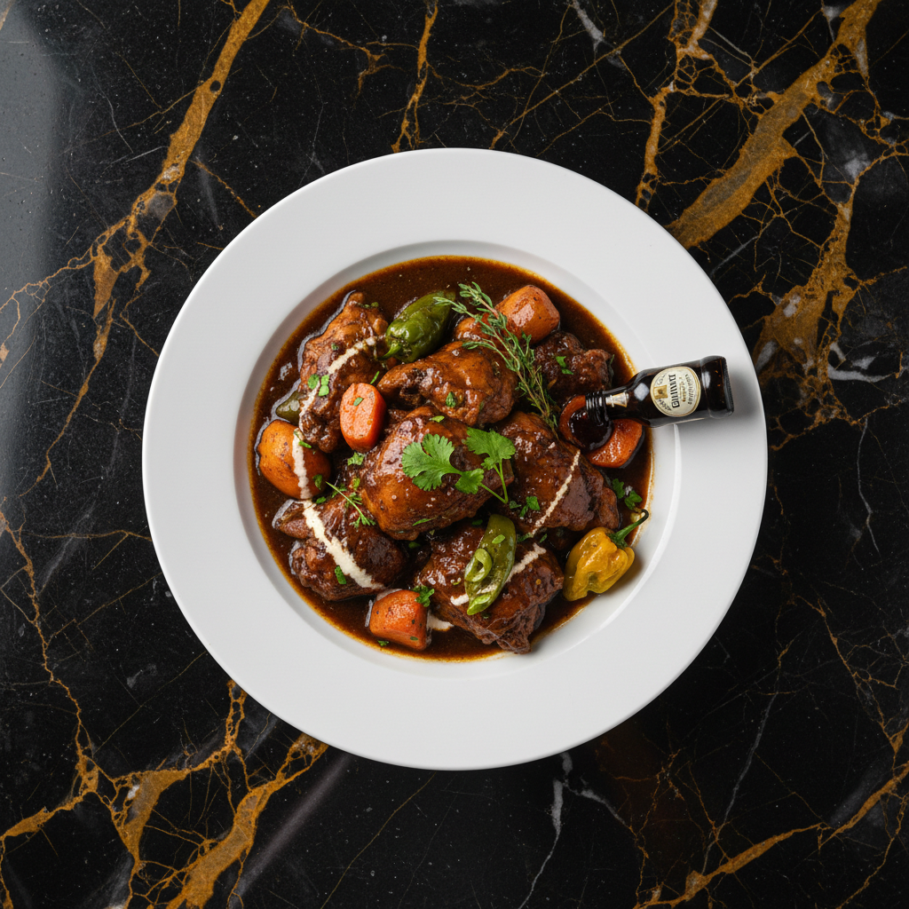 A hearty and flavorful chicken stew made with Guinness stout, vegetables, and aromatic spices, offering a rich, deep taste that is both comforting and satisfying.