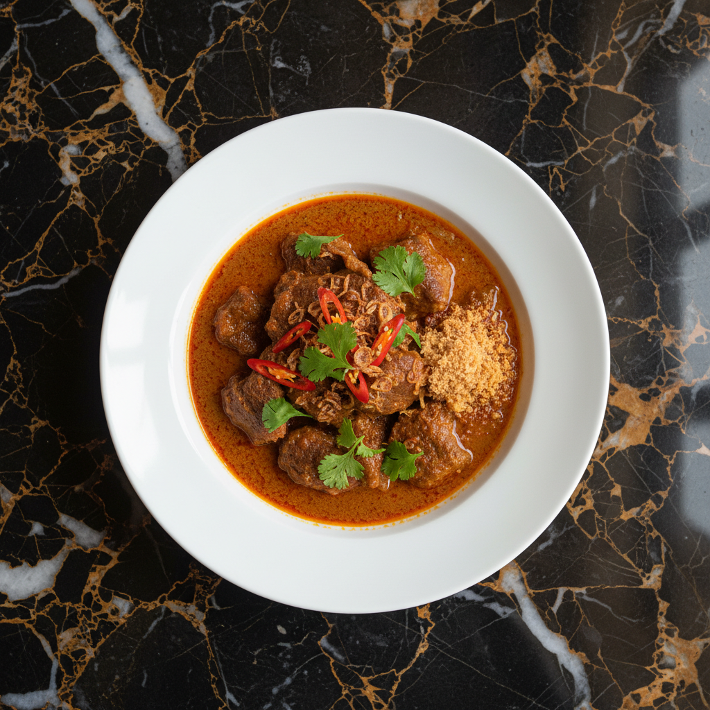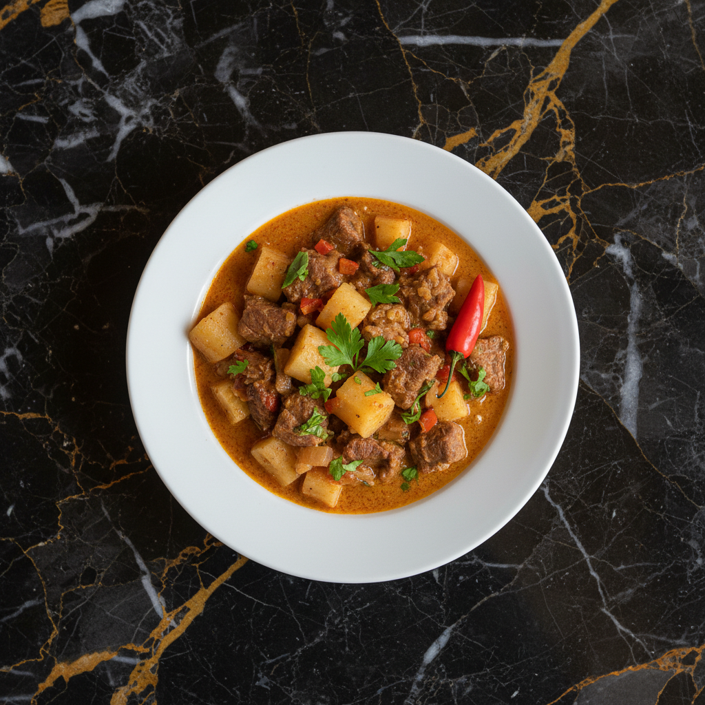 A rich and aromatic beef curry cooked in a large pot, traditionally prepared for Malaysian feasts (kenduri). This Gulai Kawah features tender beef simmered in a luscious coconut milk gravy, infused with a complex spice paste (rempah) and finished with toasted coconut (kerisik) and potatoes.